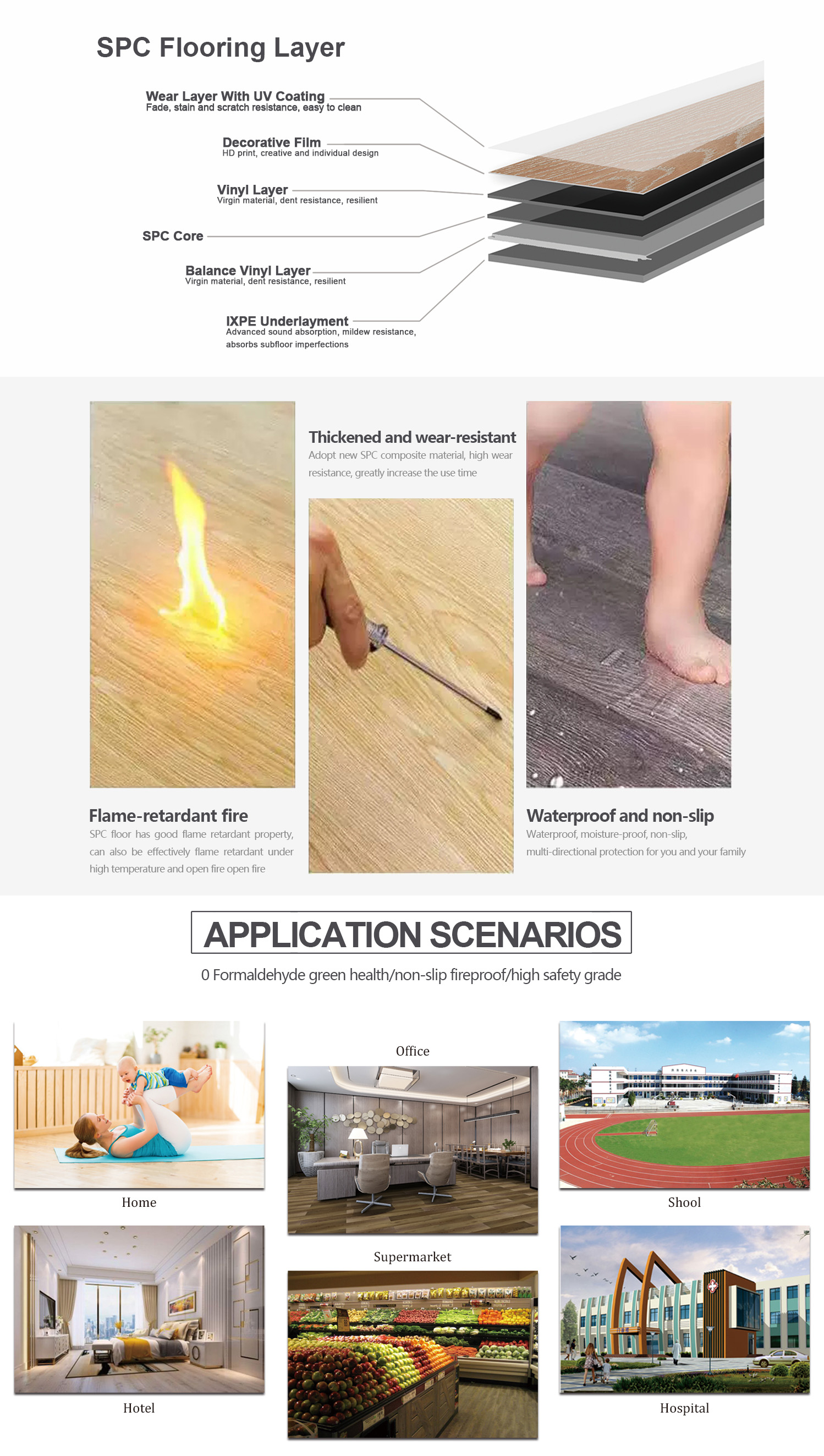 SPC floor is the main raw materials of high quality PVC resin, calcium powder, natural environmental protection, 100% free of formaldehyde, lead, benzene, no heavy metals and carcinogens, no soluble volatiles, no radiation, can be called the 21st century high-tech new materials model!